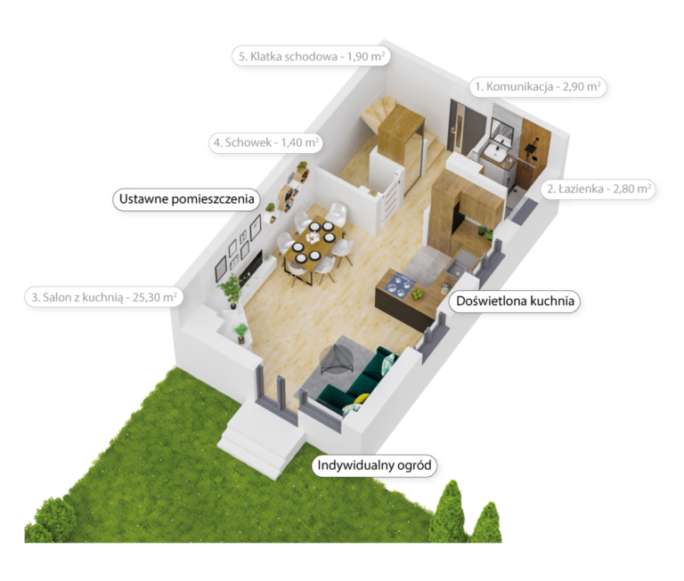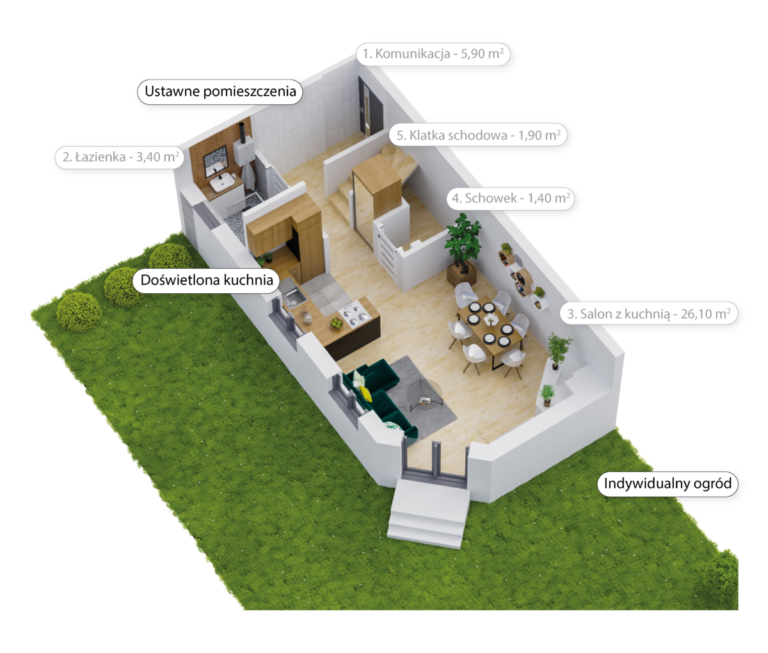 Każdy lokal ma indywidualny ogród o powierzchni od 87 do 172 m² – to znakomita przestrzeń do relaksu, zabaw z dziećmi, spotkań z rodziną i znajomymi czy uprawy roślin.