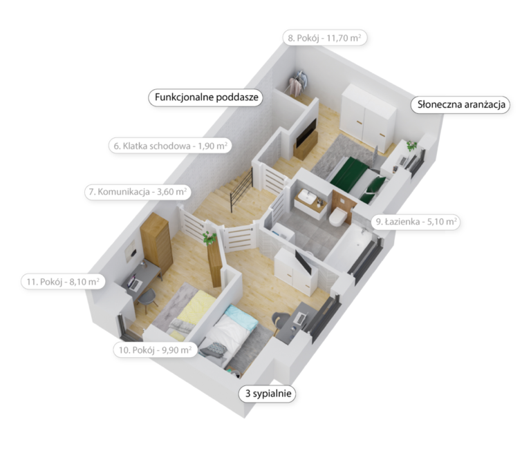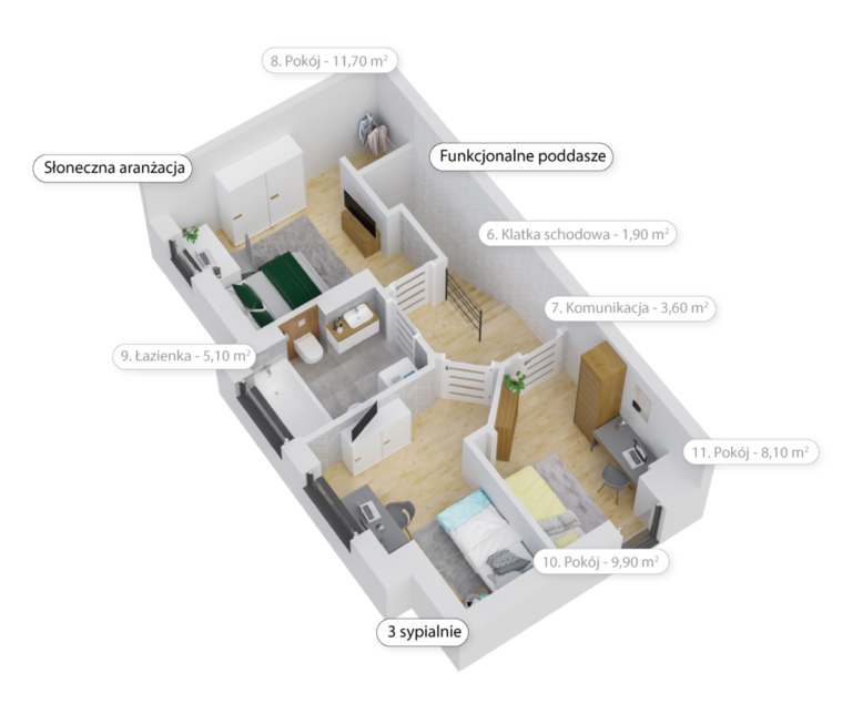 Dwa rodzaje piętrowych lokali o powierzchniach 74,6 m² i 79 m², każdy z dużym salonem z kominkiem oraz aneksem kuchennym, dwiema łazienkami, trzema sypialniami, schowkiem i poddaszem do aranżacji.